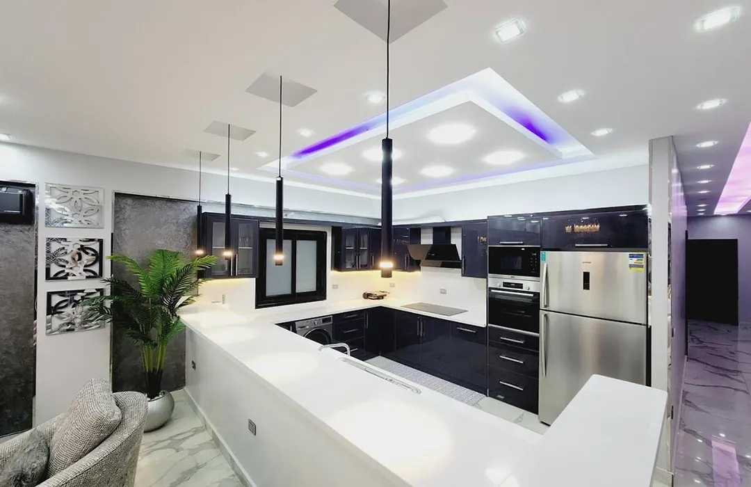 El apartamento New Cairo'S King Bed Gem Dream Stay #5 dispone de una cocina completa con hervidor eléctrico, lavaplatos y nevera.